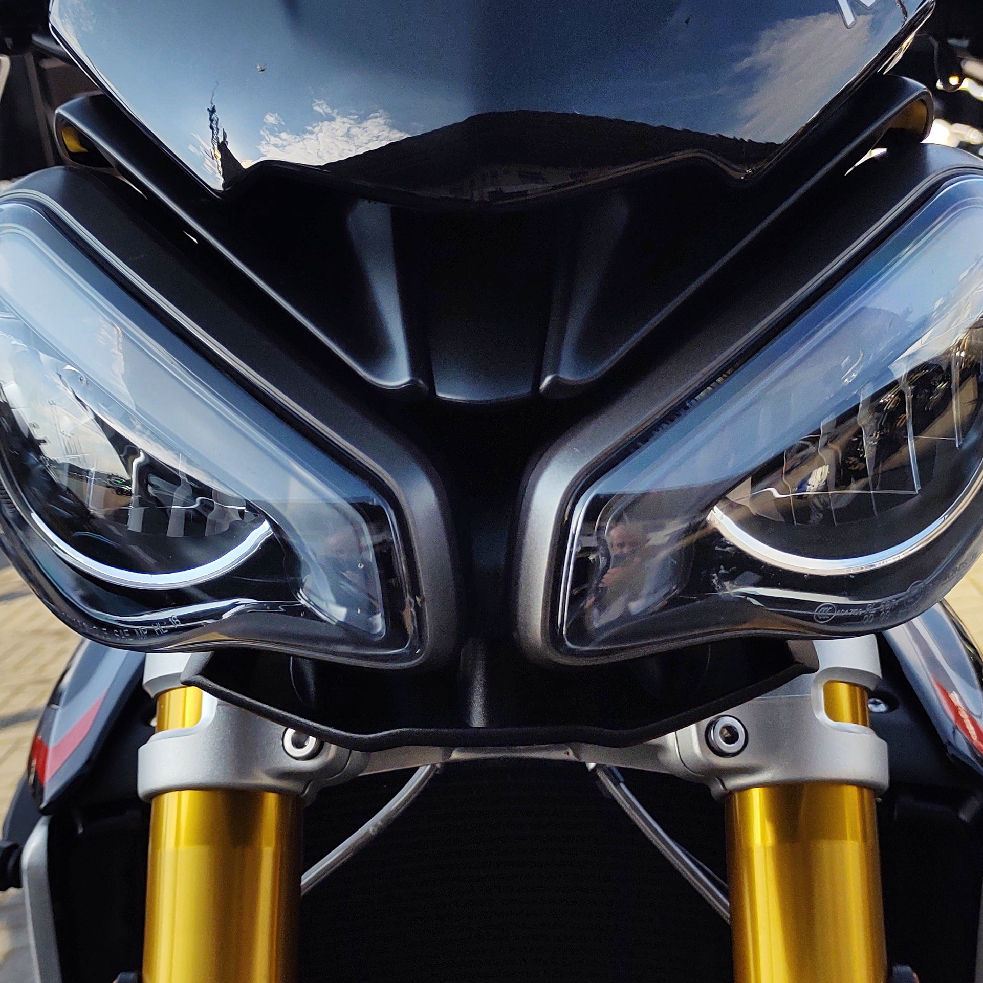 Das Design der 2021er Speed Triple 1200 RS ist eine konsequente Weiterentwicklung der Speed Triple Optik. Nach Einfach-Scheinwerfer in den ersten Modelljahren, den runden Doppelscheinwerfern der späteren Jahre ermöglicht die LED-Technik eine modern wirkende Version der Speed Triple typischen frei stehenden Doppelscheinwerfer.